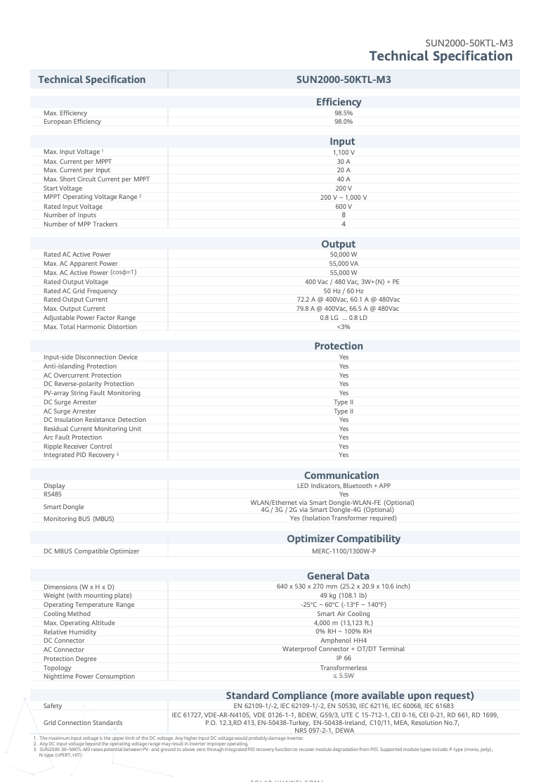 INVERSOR SOLAR M3 TRIF. 4MPPT 380V 50KW COM AFCI - HUAWEI